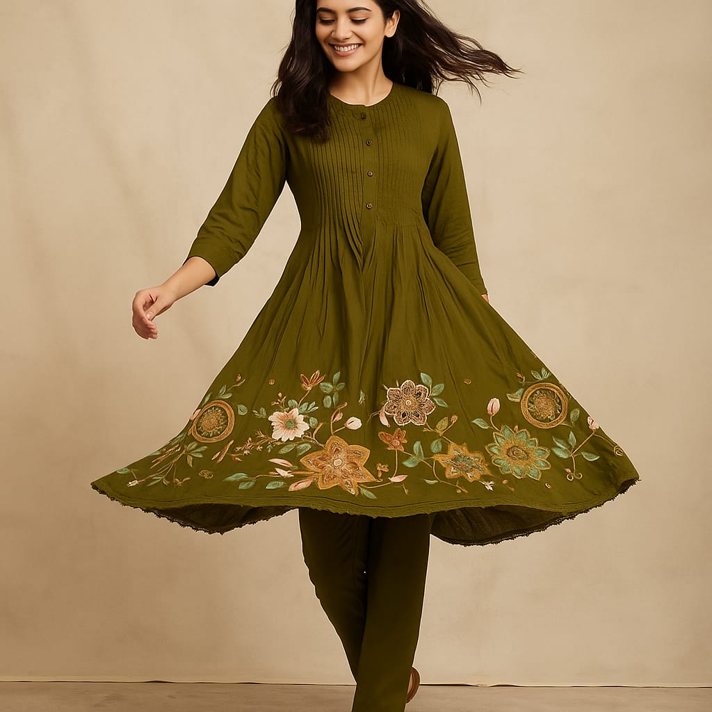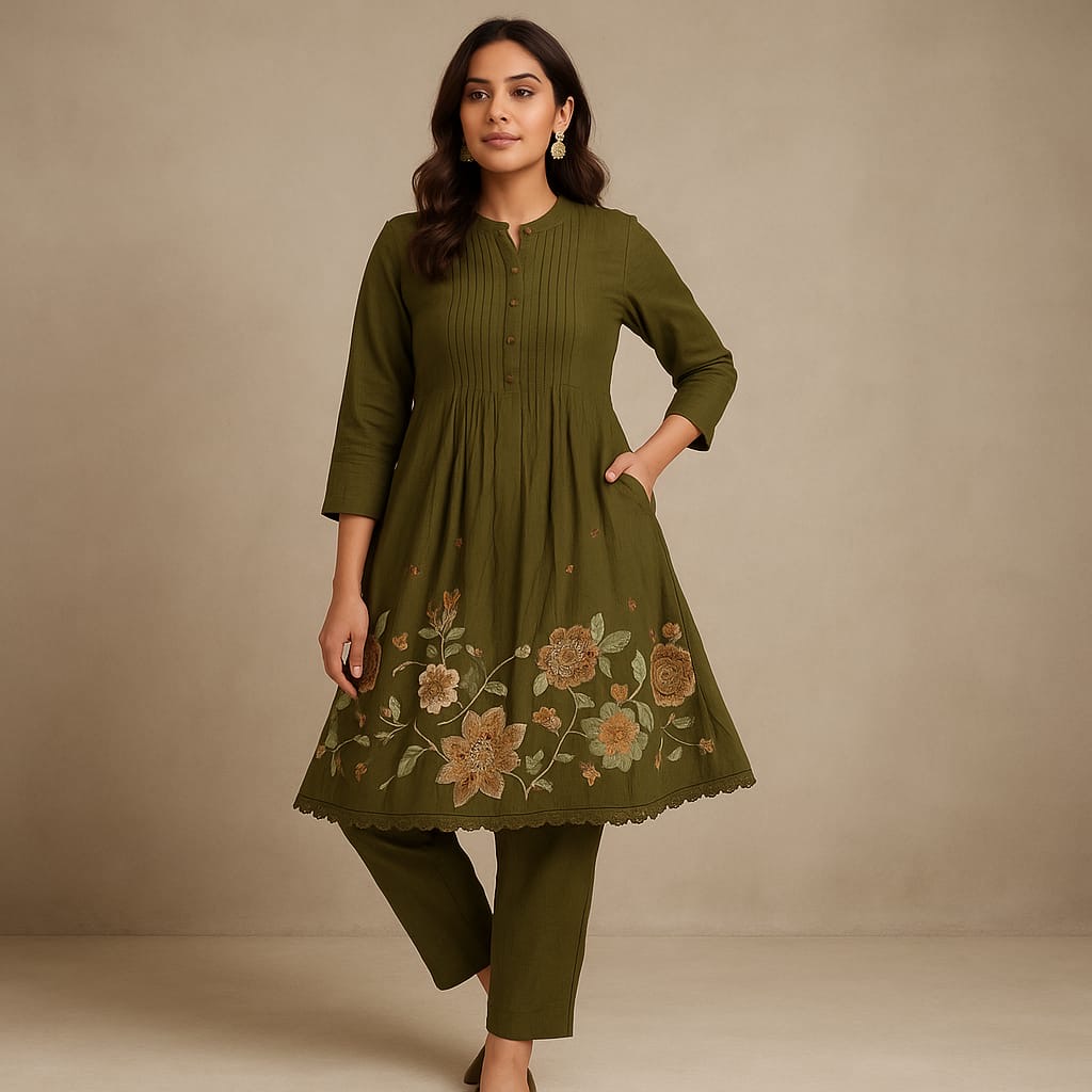 Grace meets craftsmanship in this long-sleeved green dress, featuring floral embroidery along the hemline and pleated bodice detailing. Paired with matching trousers, it blends comfort and charm with a touch of heritage.