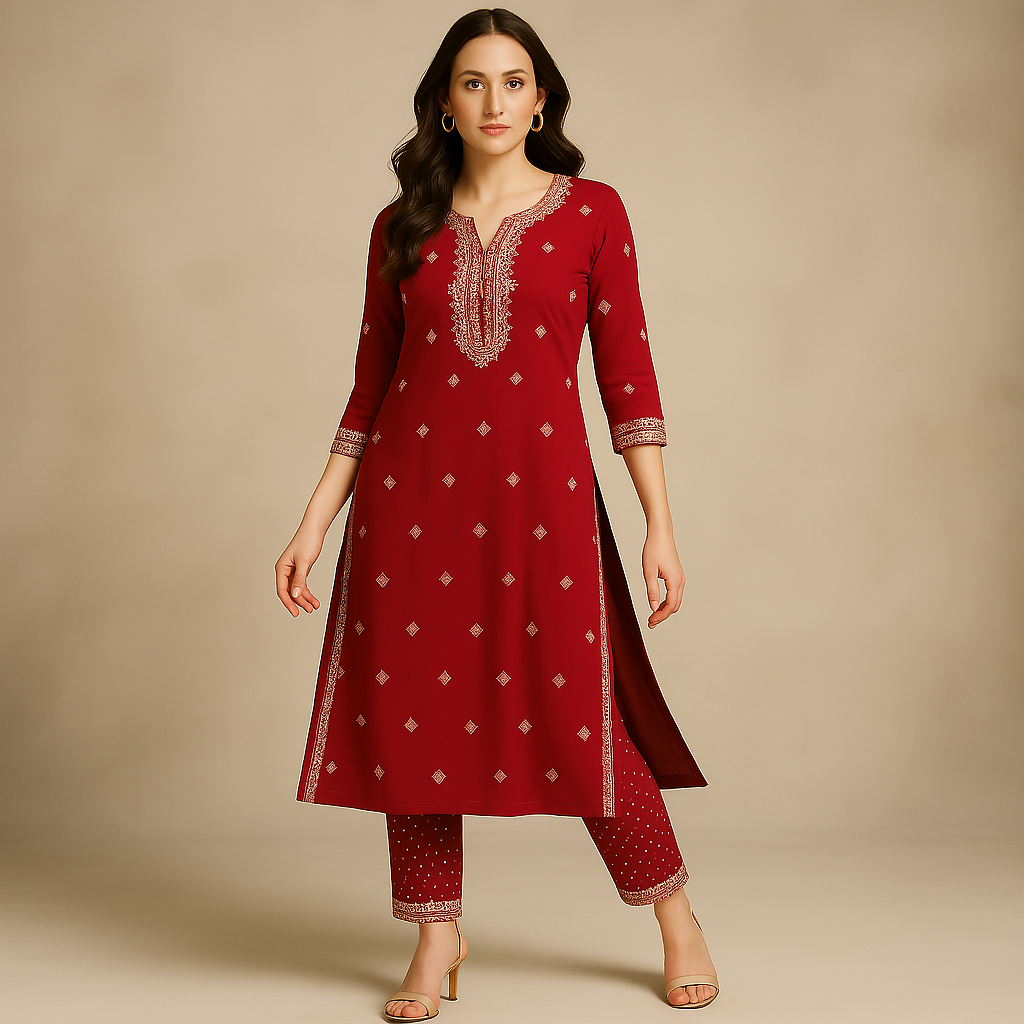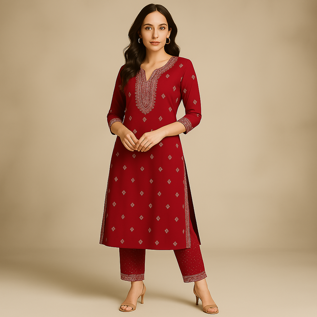 Elegantly crafted in rich red fabric, this traditional ensemble features a three-quarter sleeve kurta adorned with silver embroidery and scattered diamond motifs. Paired with matching pants and finished with embroidered cuffs, it’s a perfect blend of grace and heritage—ideal for festive gatherings or refined cultural settings.