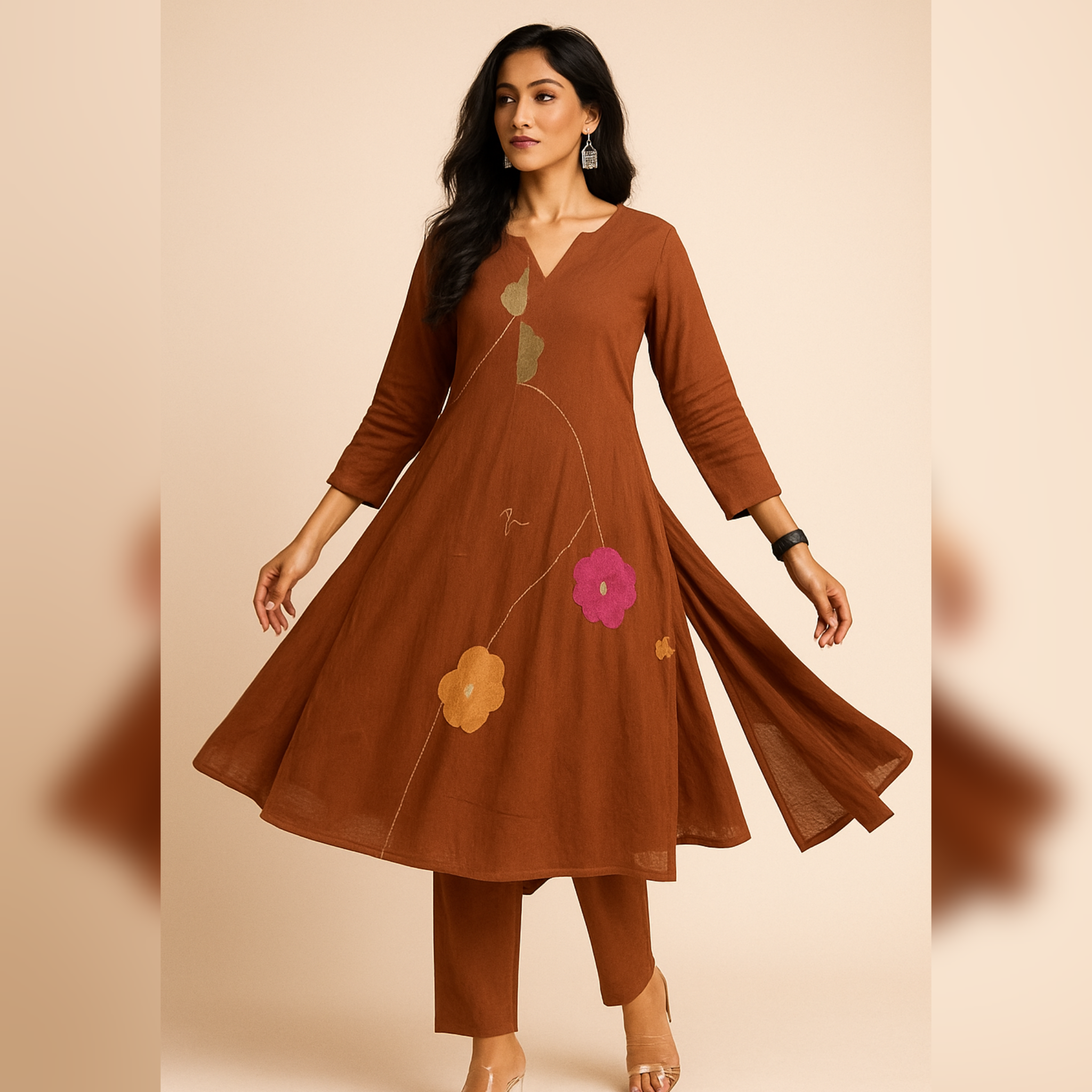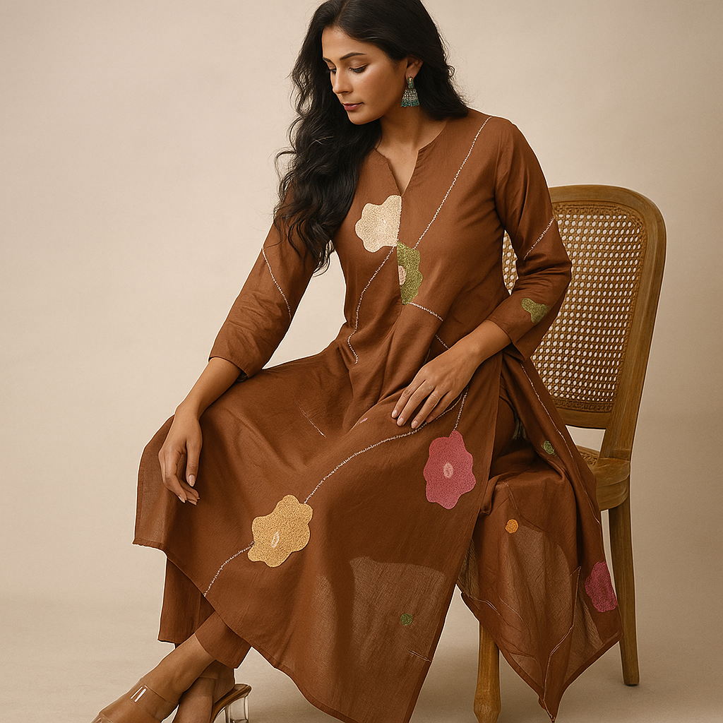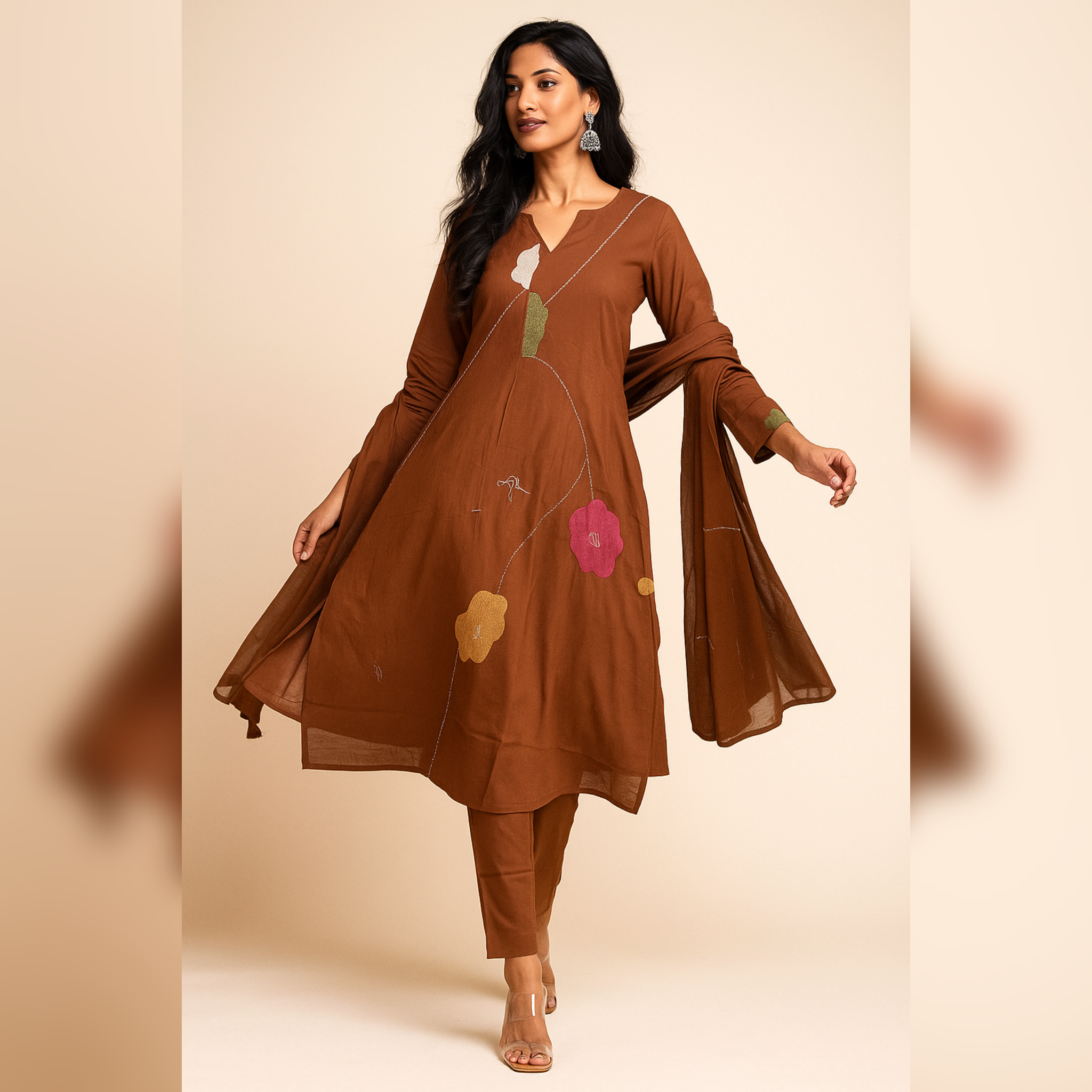 Chocolate Brown jaipur cotton 3 piece set with thread embroidery work