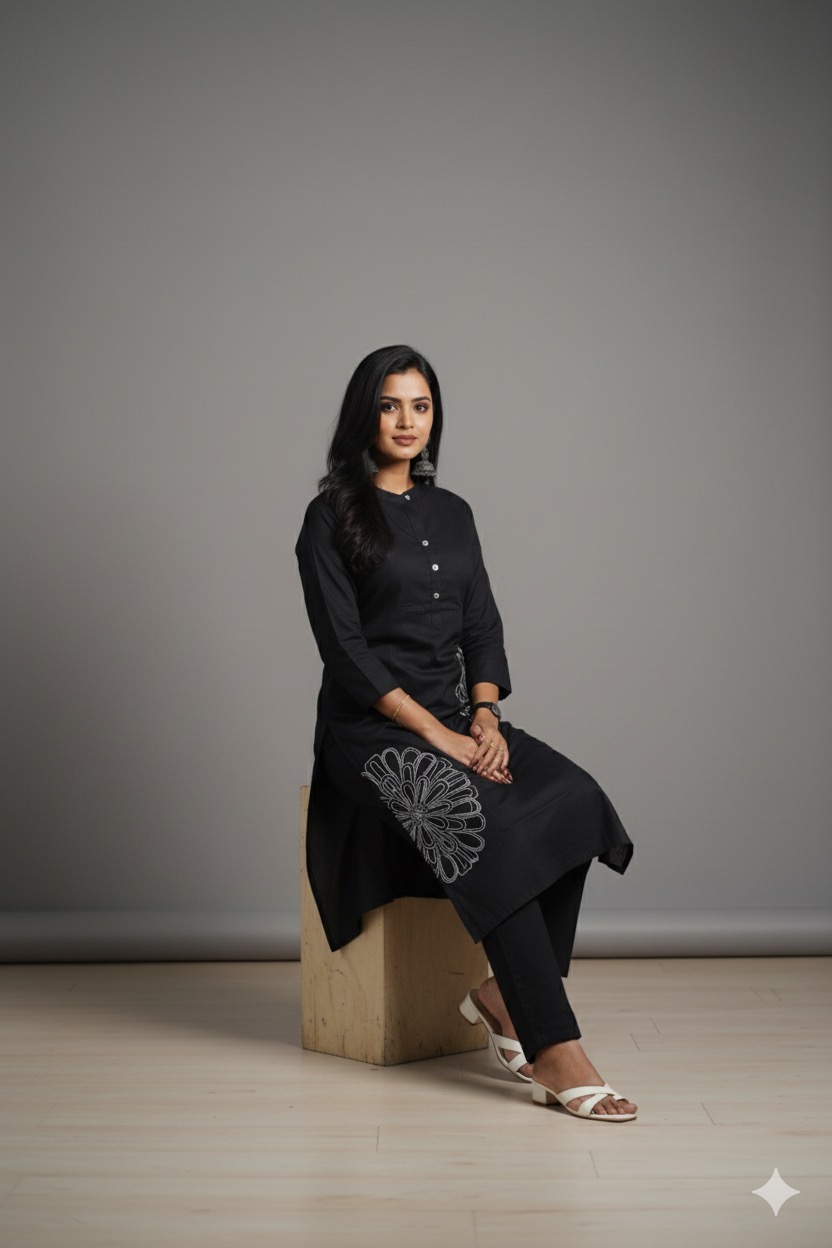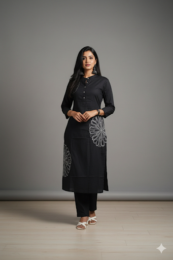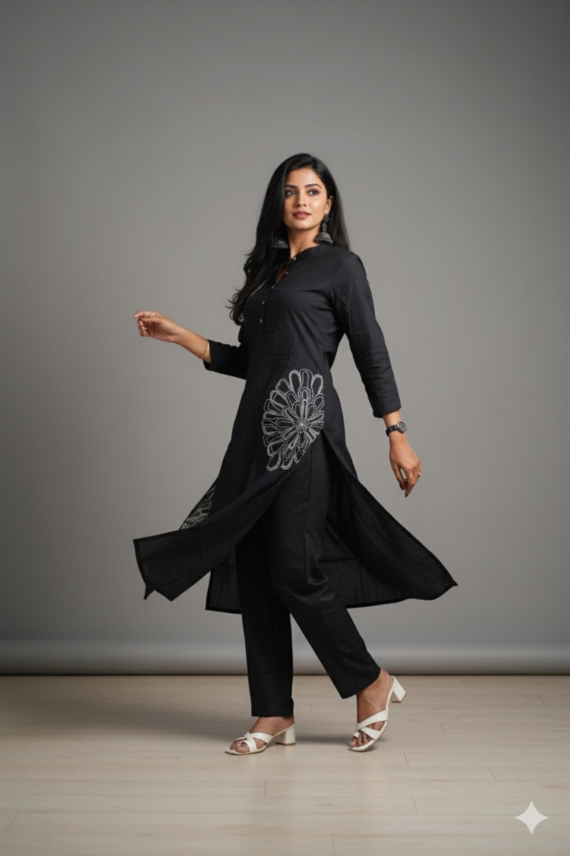 Black clour cotton cord set with designer thread work