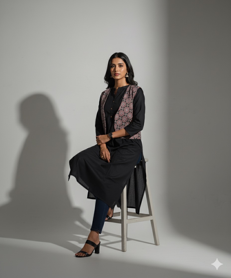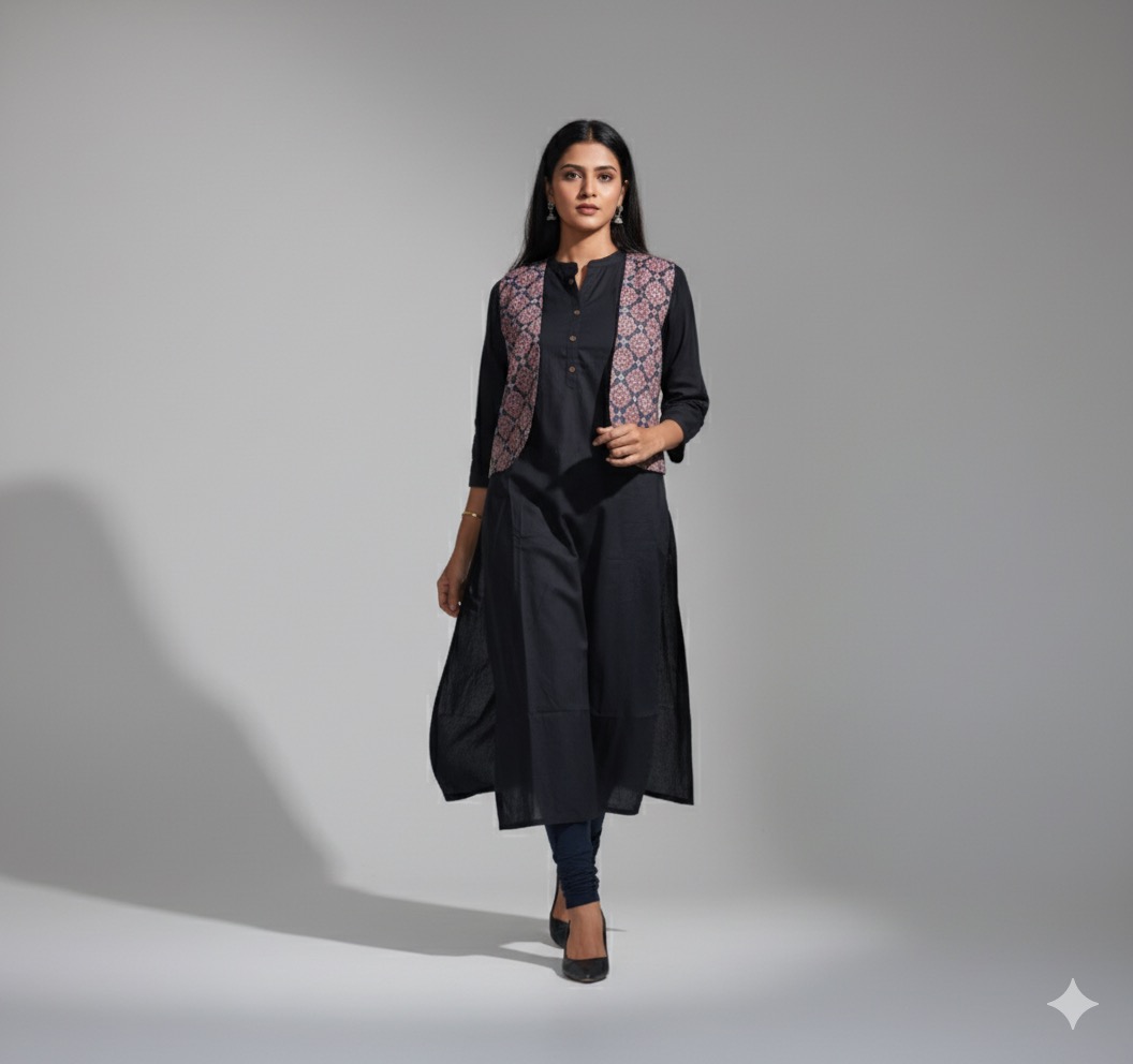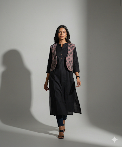 Jaipur cotton black colour top with ajrack print coat