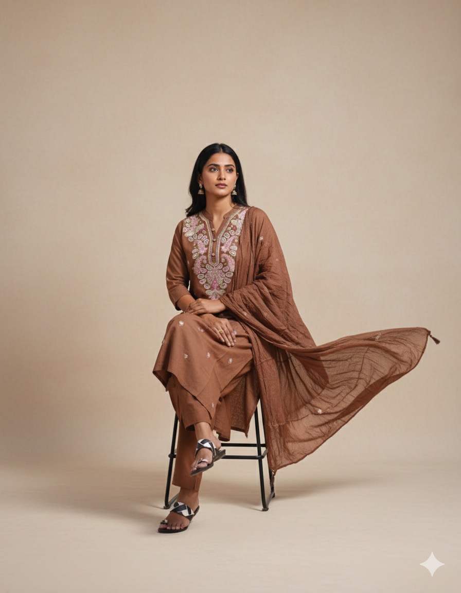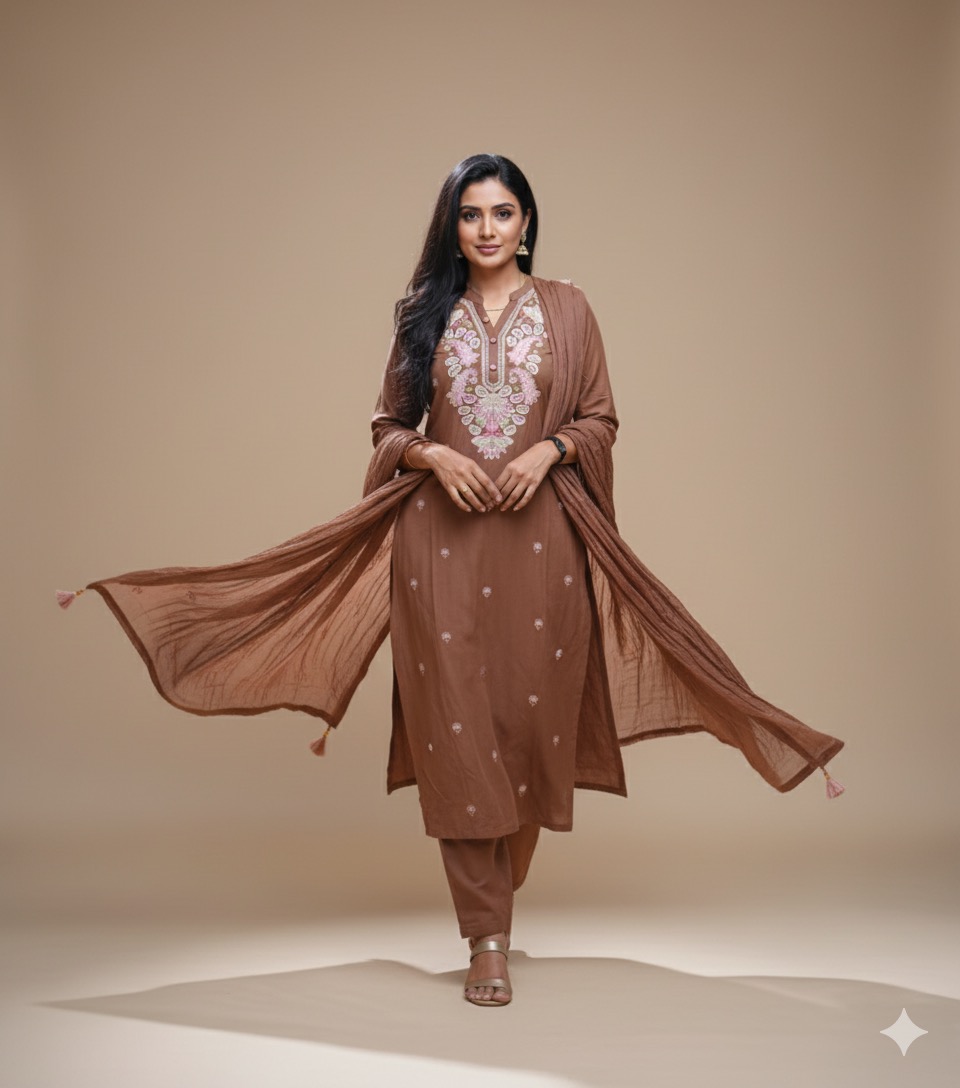 Brown colour jaipur cotton 3piece set with thread embroidery work