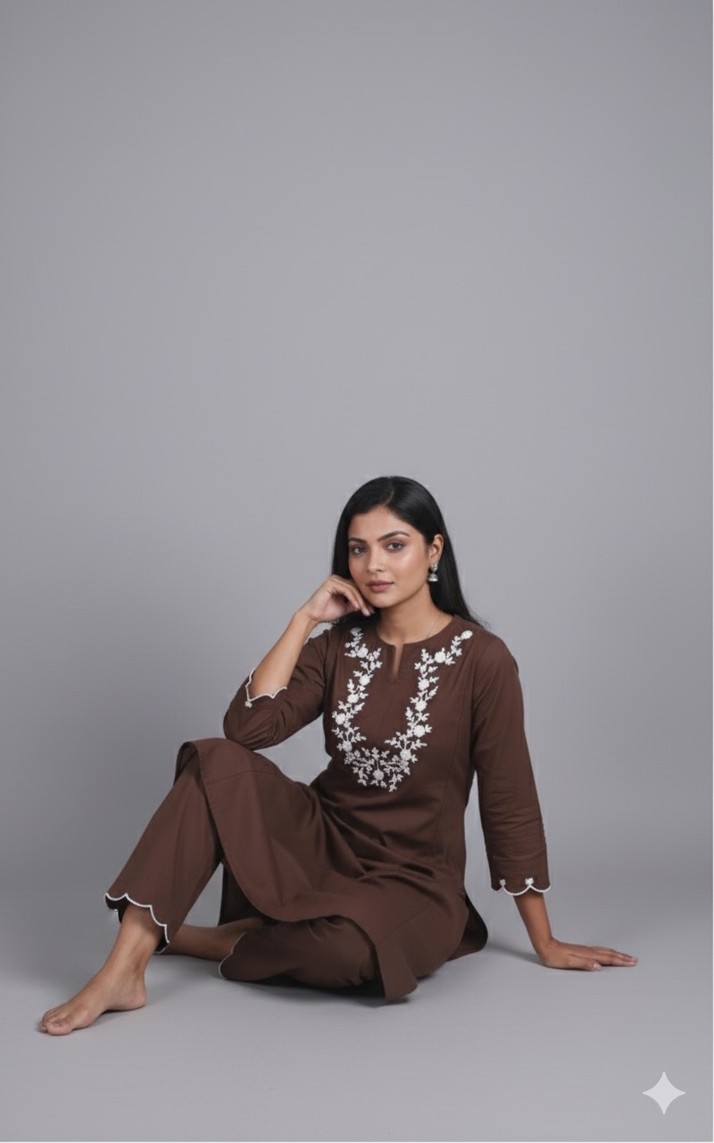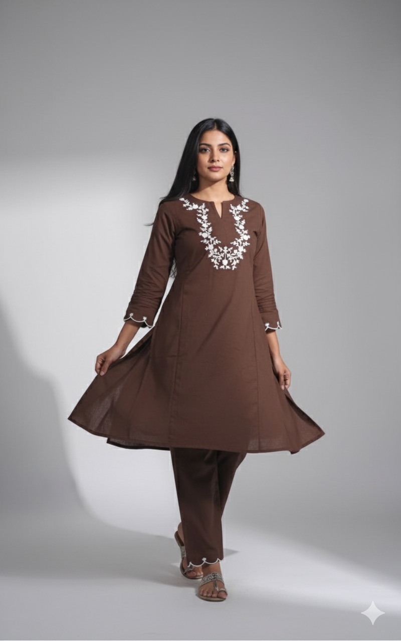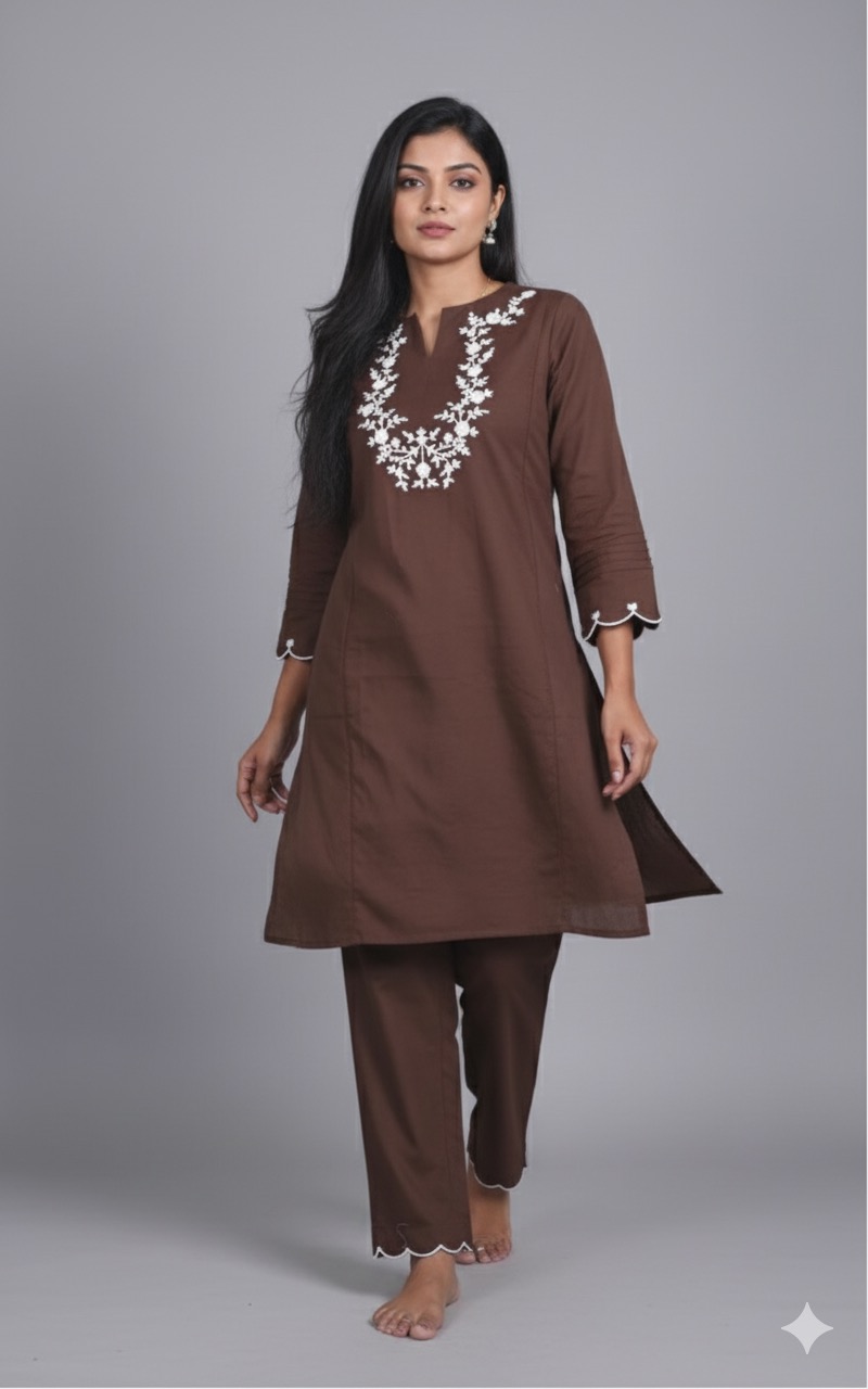Chocolate brown cord set with necklace design thread embroidery work