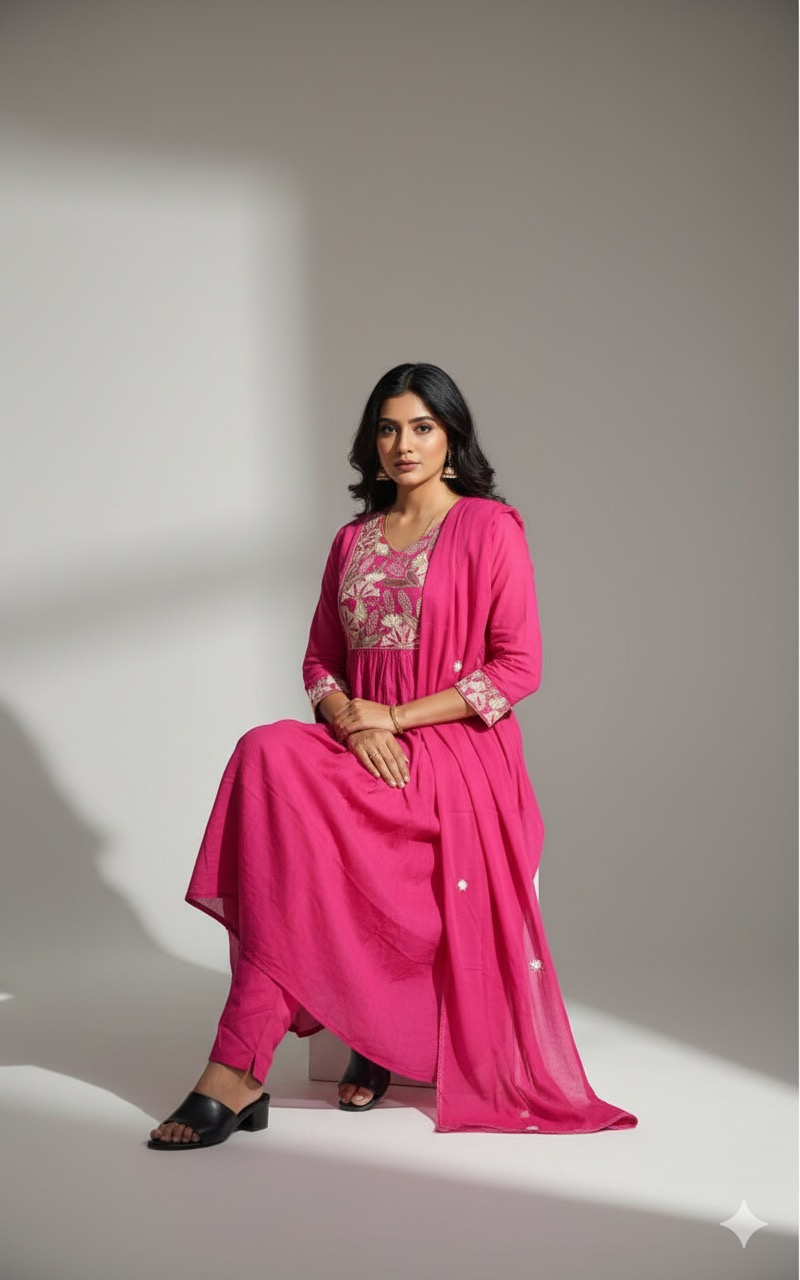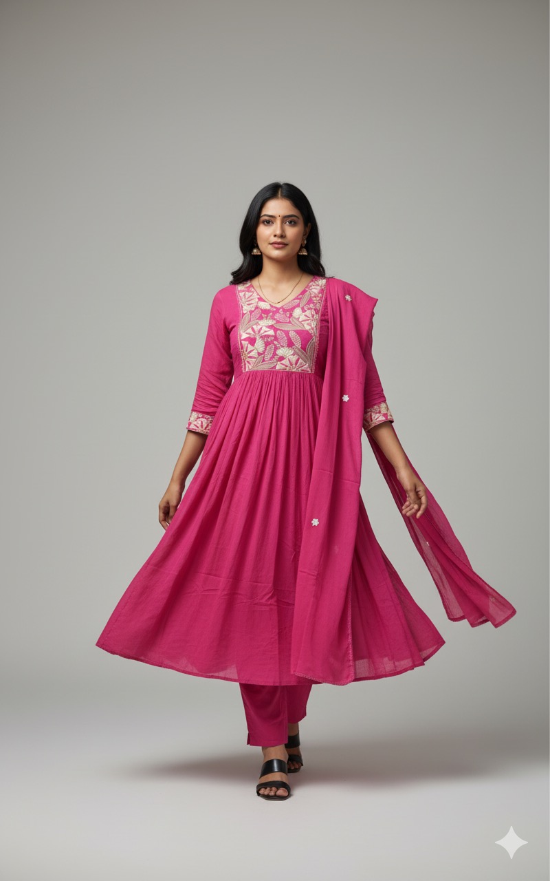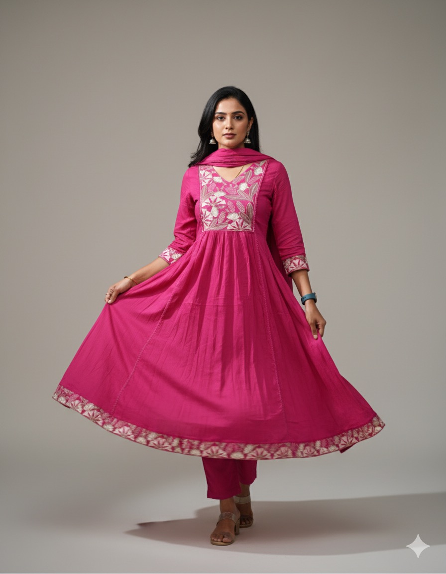 Pink colour mul mul cotton anrkali 3 piece set with complete lining