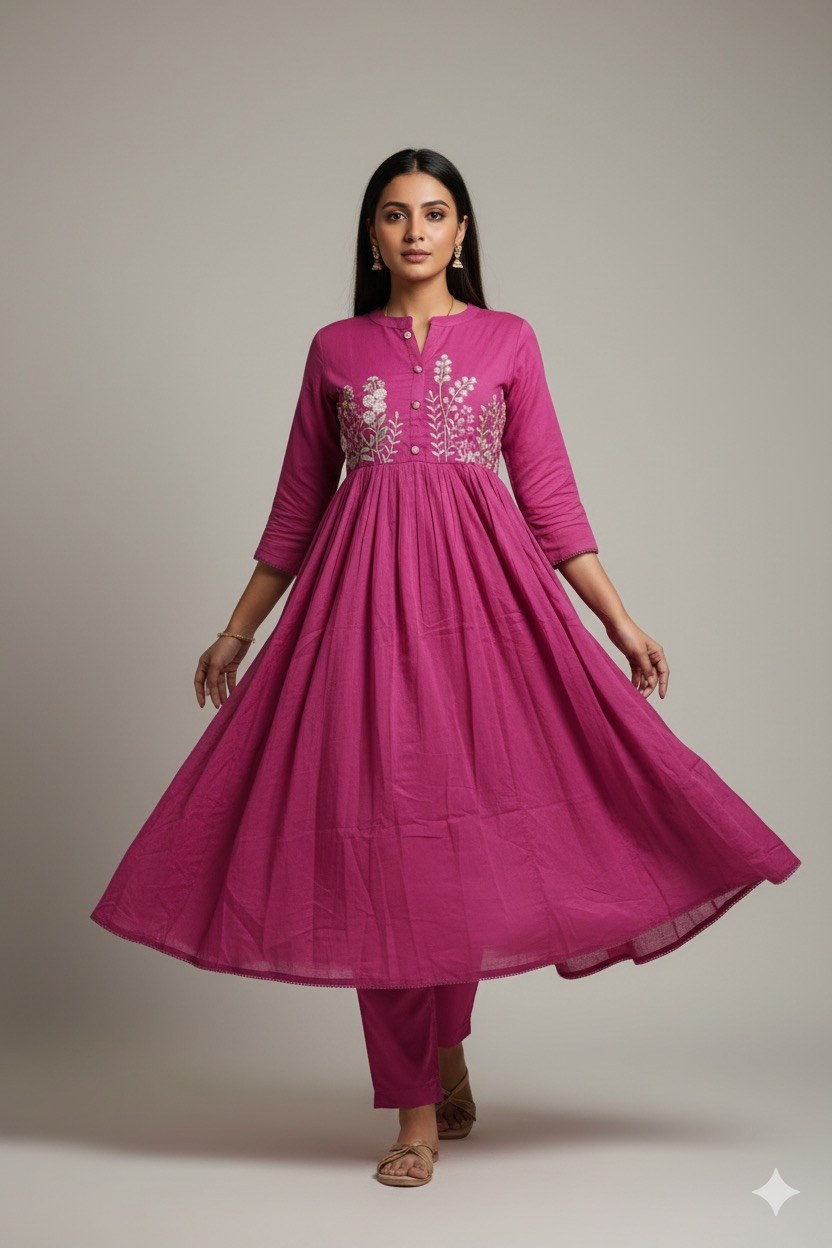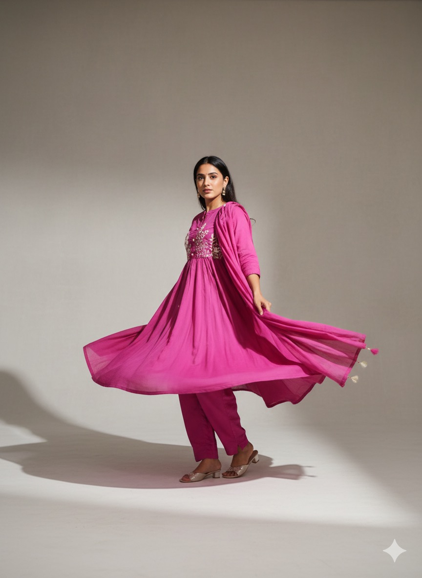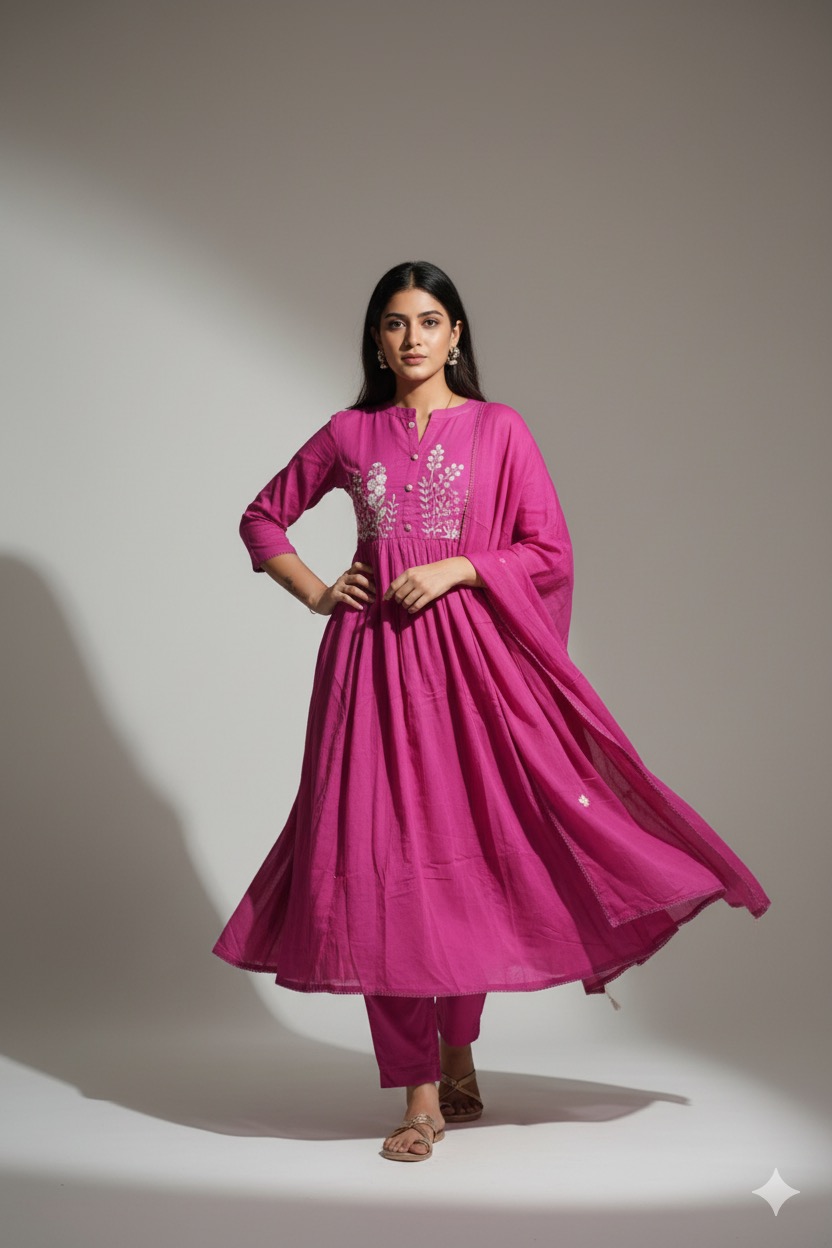 Pure mul mul cotton pink colour anarkali 3 piece set with complete lining