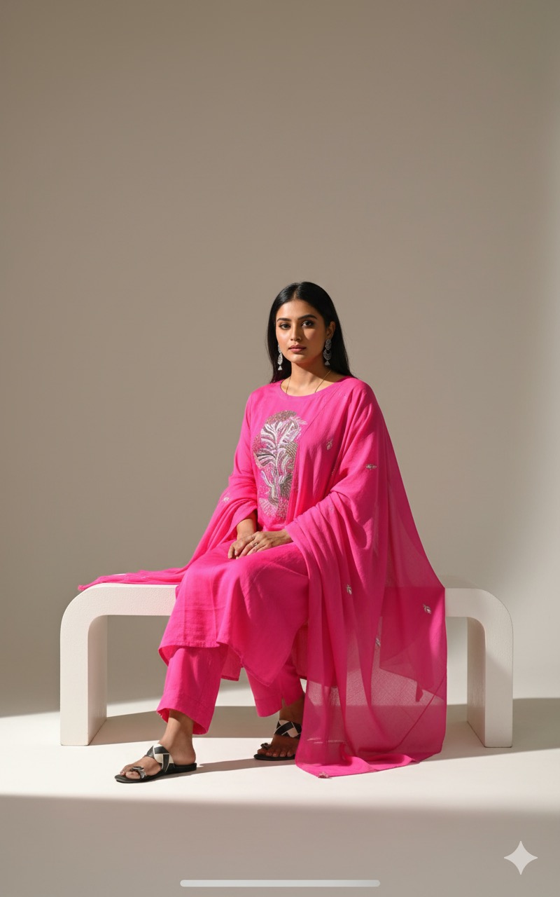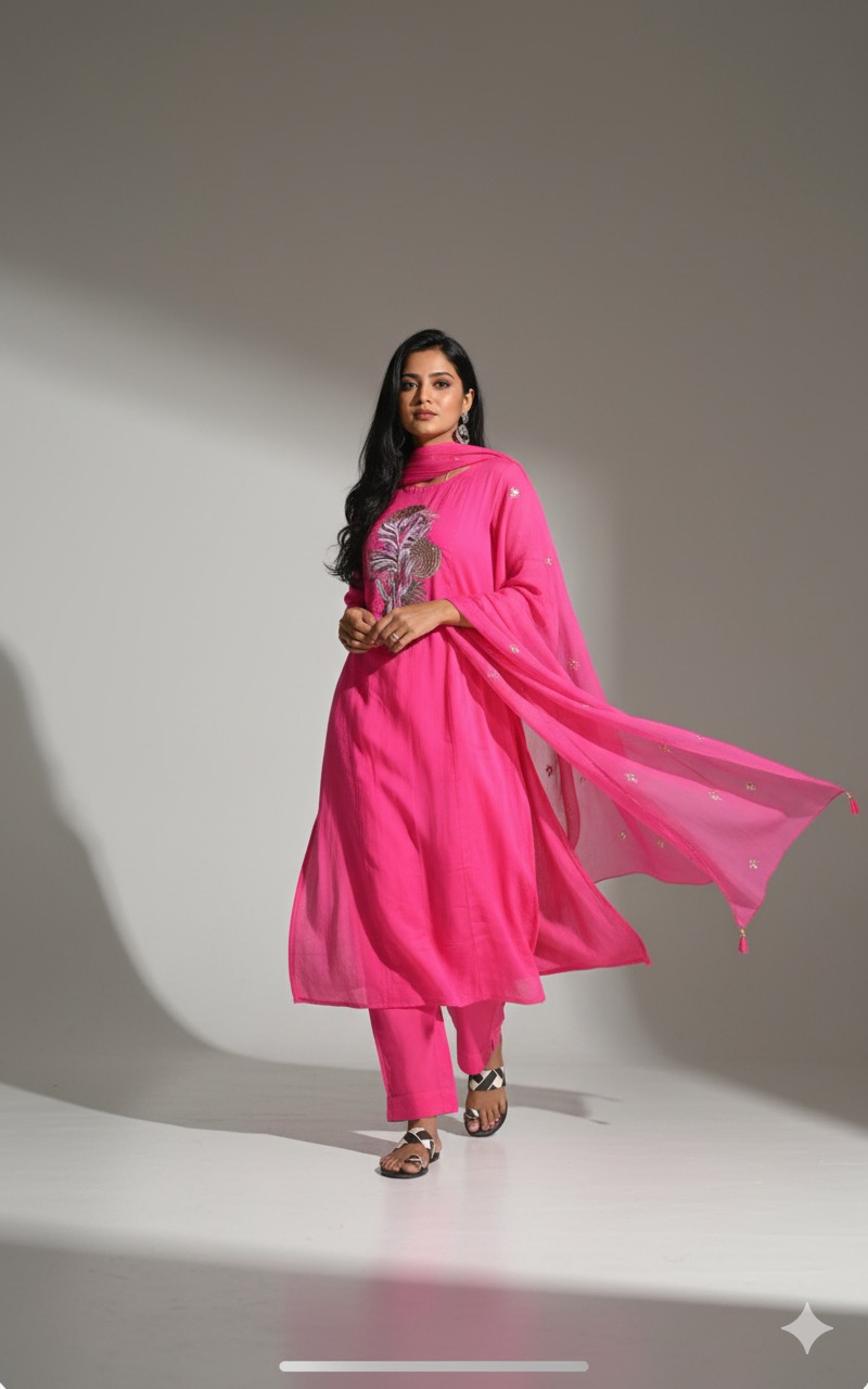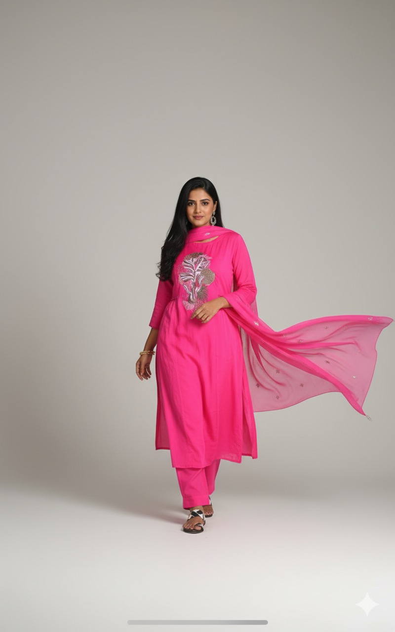 Rani pink colour pure mul cotton Embroidery design 3piece set with complete lining
