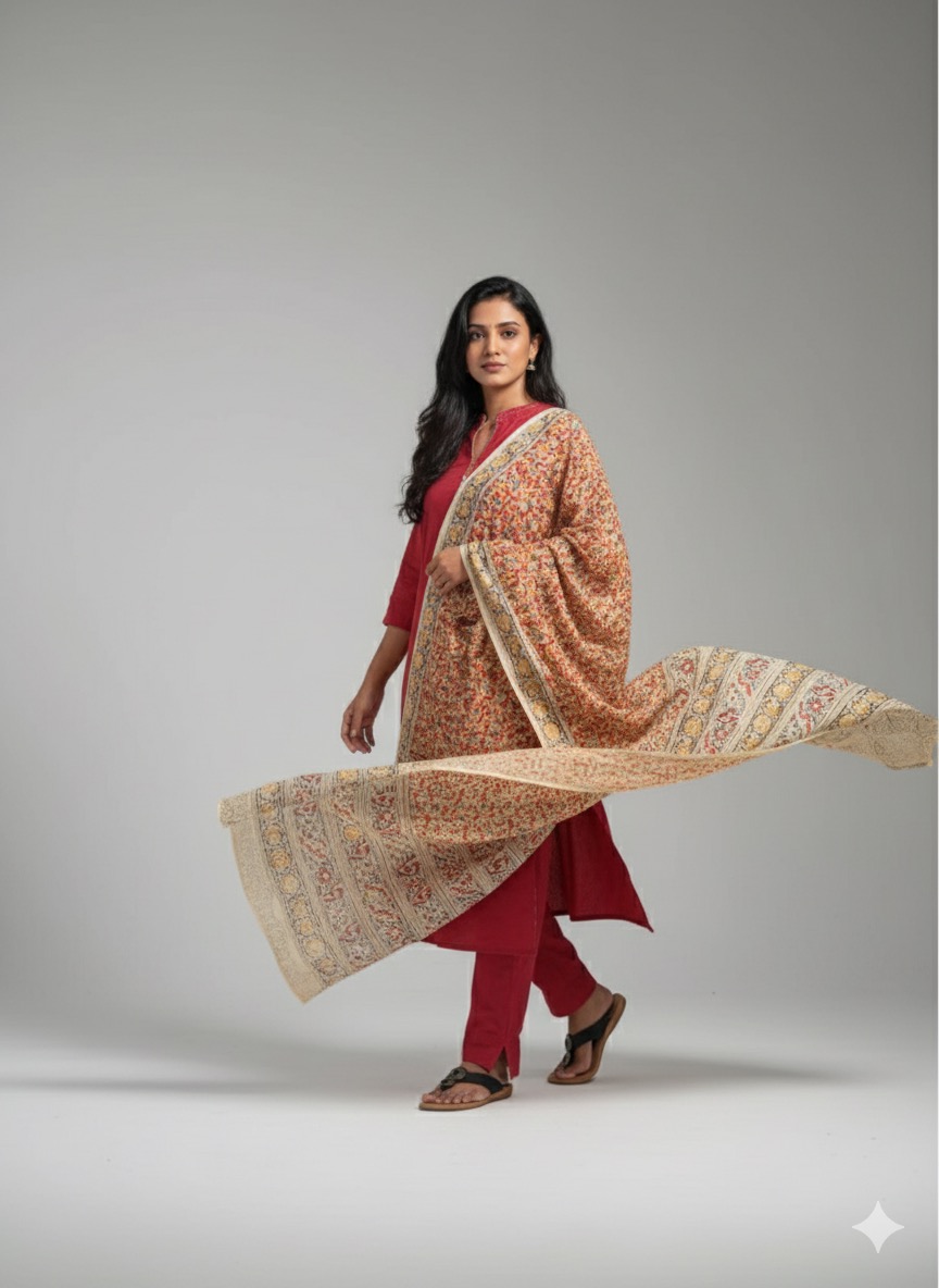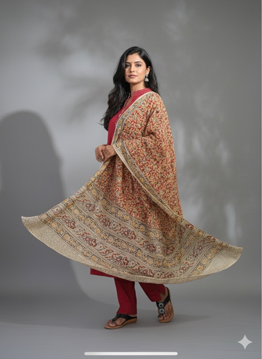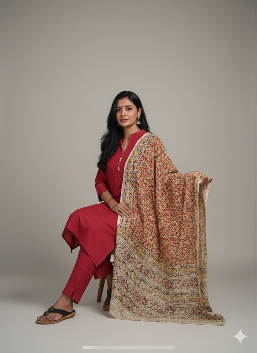 Red colour pure jaipur cotton Chinese colar straight cut with kalamkari dupatta